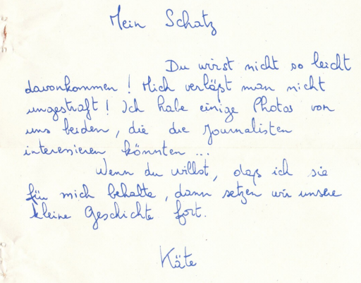 du wirst nicht so leicht davonkommen ! mich verlapt man nicht ungestaft ! Ich habe einige photos von uns beiden, die die journalisten, interessieren konnten...